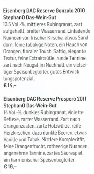 Im gerade erschienenen neuen Falstaff-Magazin konnten wir erneut zweimal 90 Punkte mit unserem gonzalo Eisenberg DAC Reserve 2010 und unserem neuen prospero Eisenberg DAC Reserve 2011 erreichen.