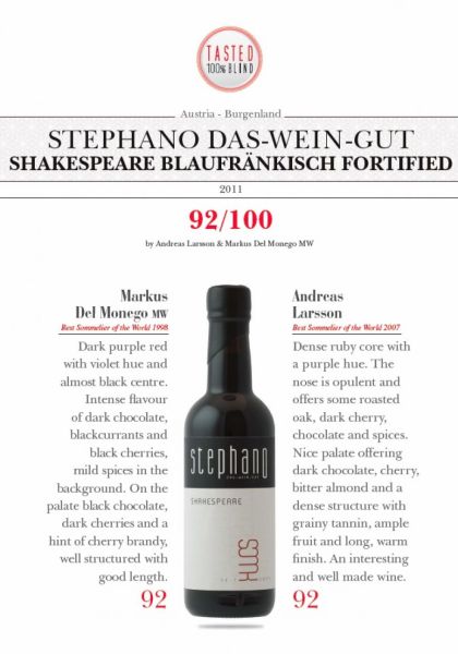 Im Rahmen einer weltweiten "sweet wine" Verkostung wurde von den beiden Sommeliers Markus Del Monego und Andreas Larsson für das "TASTED 100% BLIND" Magazin unser shakespeare 2011 - Blaufränkisch fortified mit überragenden 92 Punkten bewertet und kann sich nun zu den besten Süßweinen der Welt zählen!shakespeare ist ein "late bottled vintage port" aus 100% Blaufränkisch aus dem Südburgenland!