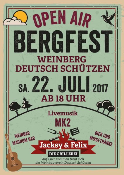Am 22. Juli findet zum zweiten Mal ab 18 Uhr das bereits aus früheren Jahren legendäre Bergfest des Weinbauvereins Deutsch Schützen statt!